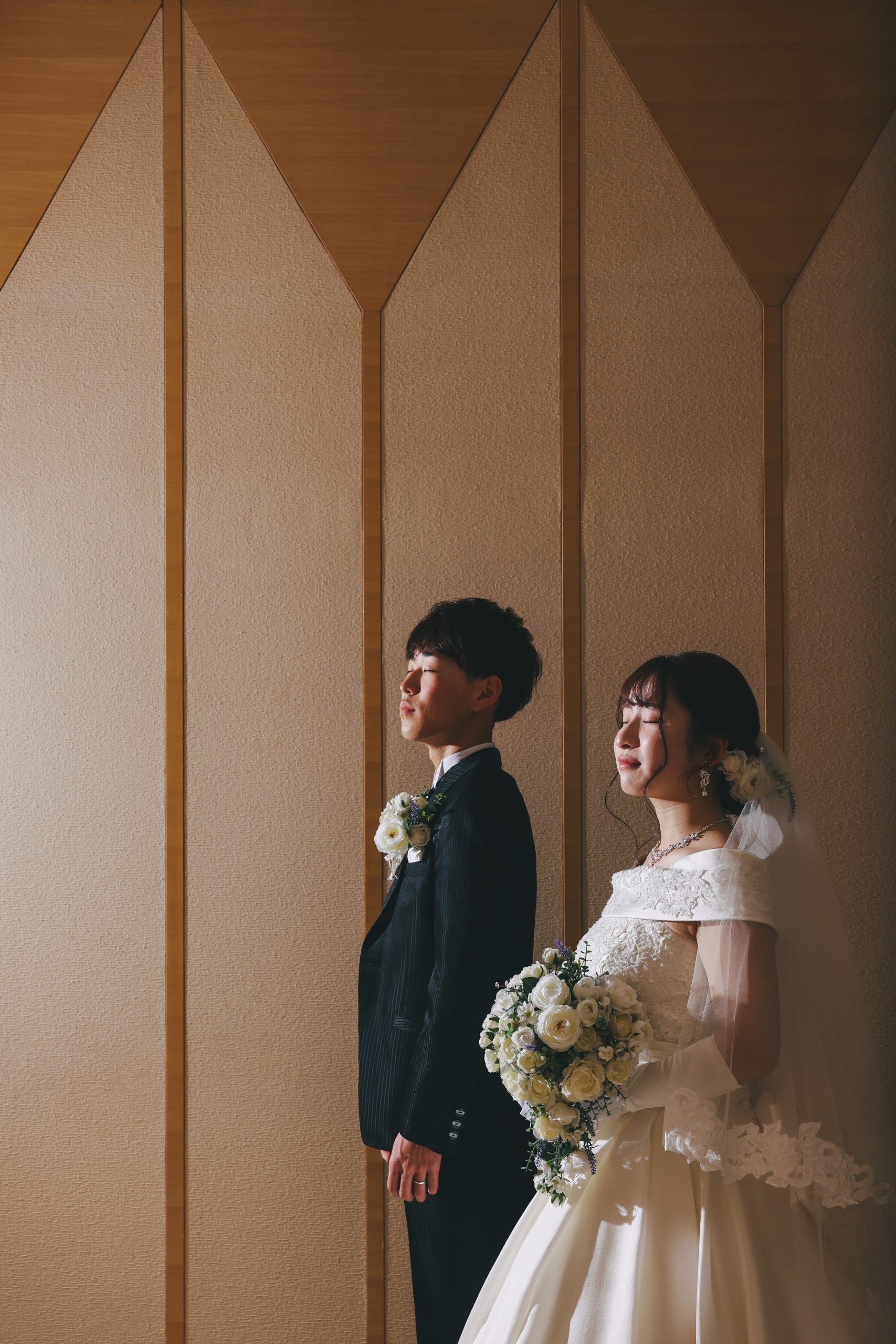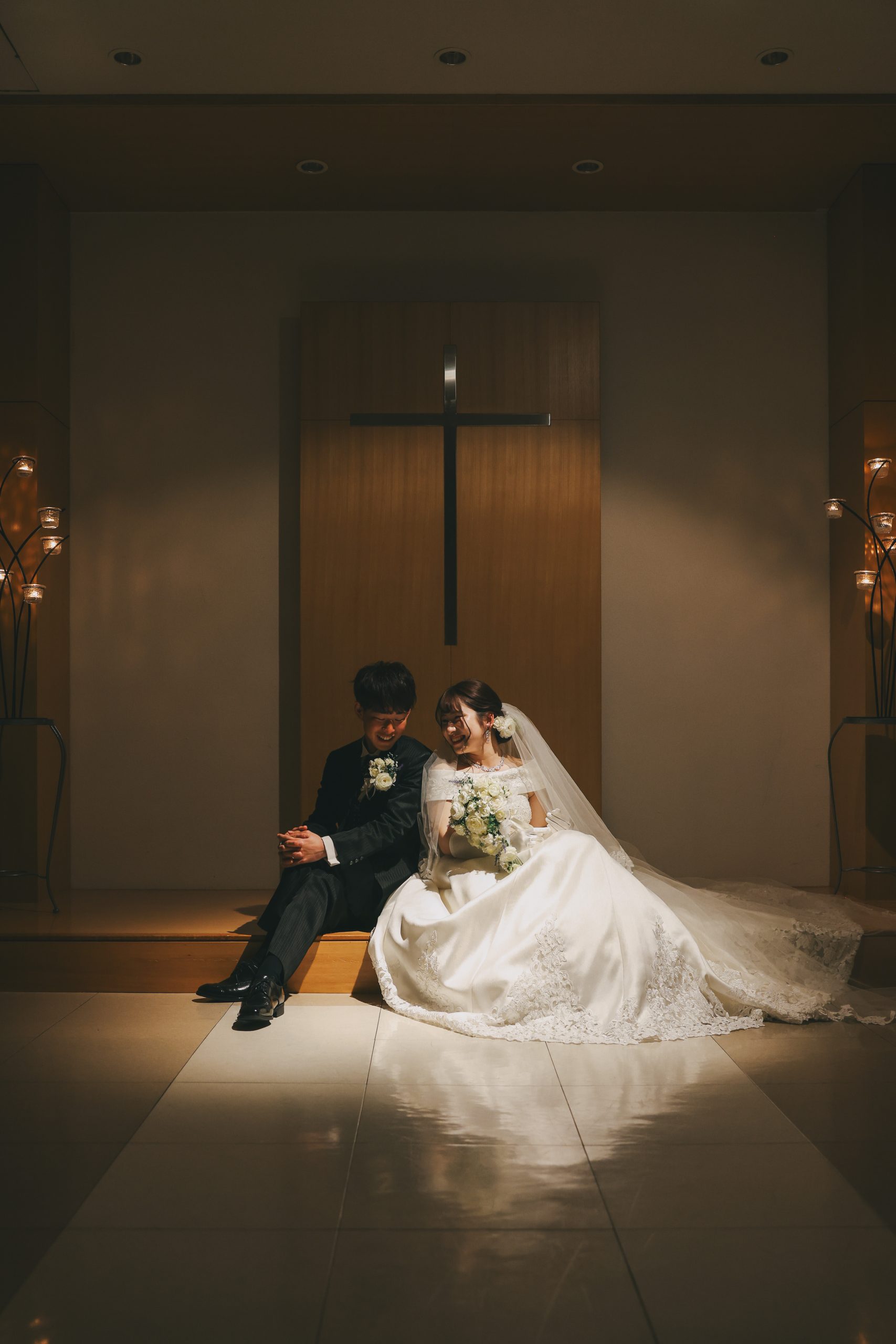 チャペルにて入場から指輪の交換、誓いのキスなど実際の結婚式の流れのを撮影いたします。広々としたチャペルですのでご家族の見学も可能。ステンドグラスが美しい本格チャペルでの撮影が叶うプランです。